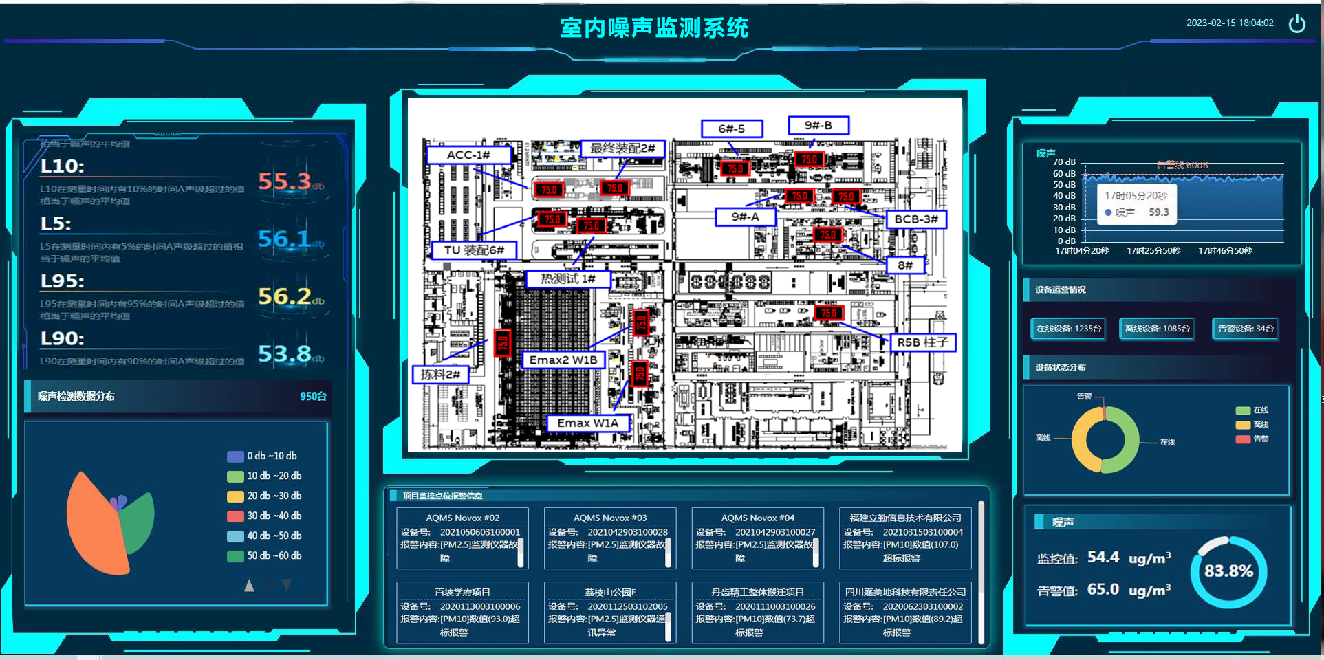 The networking center platform receives alarm information from the front-end alarm host, automatically displays video pop ups, and can be managed at multiple levels on multiple platforms. The platform also has emergency broadcasting functions. The dormitory noise monitoring screen is a device specifically designed for real-time monitoring and display of the internal noise level in the dormitory area. This large screen is usually installed in the office of the management personnel to effectively monitor and manage the environmental noise inside the dormitory. Through this noise monitoring screen, management personnel can intuitively understand the noise situation in various areas of the dormitory. The screen usually displays the noise levels of different dormitory rooms or floors, quantified in decibels (dB). Once the noise in a certain area exceeds the preset standard value, the backend management end will issue a warning to remind the management personnel to take timely measures.