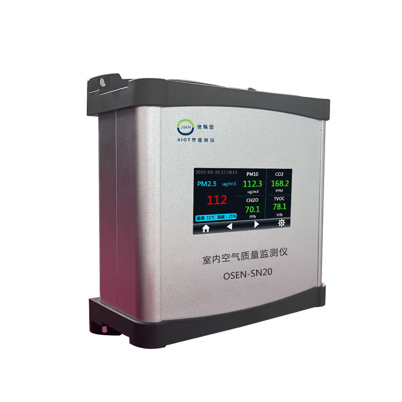 The OSEN-SN20 indoor environment monitoring system continuously collects temperature and humidity data 24 hours a day PM1、PM2.5、CO2、CO、 Parameters such as formaldehyde and VOC that measure air quality can be combined with specific application scenarios to install various types of parameter air monitoring modules. Monitoring parameters can be displayed on information terminals such as mobile phones, computers, tablets, etc., allowing real-time monitoring of the monitoring situation. Support the integration of LCD screens to visually display indoor area detection data.