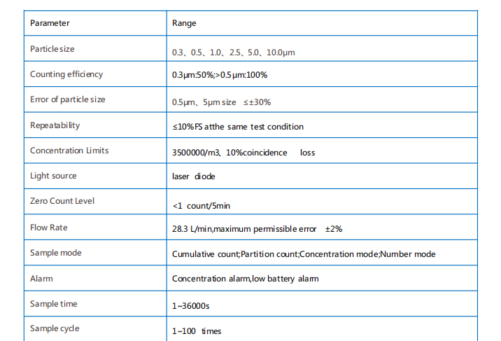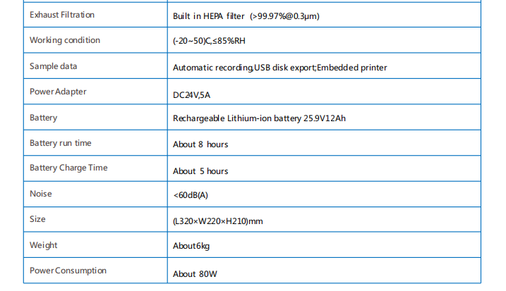 Collect and measure particles with 6 sizes atthe same time. Self contained batte ≥8h.