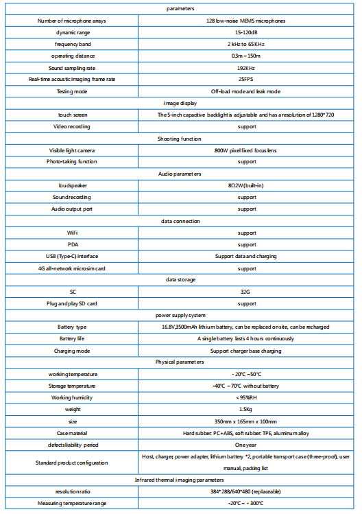 Supports audible sound and ultrasonic frequency bands, equipped with high precision MEMS sensors and 128 low noise MEMS microphones, which can capture different frequency sound waves, strictly filter out environmental noise, easily find the real source signal, and ensure the accuracy of detection.