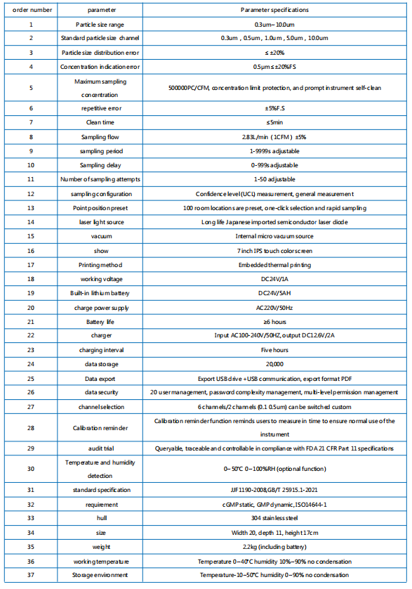 The OSEN 4001T Compact 2.83L Portable Laser Particle Counter features a stainless steel housing with an inward curved handle. Its 7 inch touchscreen delivers intuitive data visualization through simple yet efficient touch operations. Utilizing light scattering technology as its core principle, the device employs precision photoelectric sensing to measure particle size distribution and count suspended particles in clean environments.